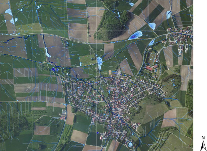 Gerade die ersten Schritte können mittels einer GIS-gestützten Topografischen Fließweganalyse durchgeführt werden. Dabei werden die Abflusswege und Überflutungsbereiche in Geländesenken ermittelt, so dass darauf aufbauend eine vereinfachte Gefahrenkarte erstellt werden kann. Dafür nötig sind die Daten über die Größe des Einzugsgebiets, den Gebäudebestand und ein digitales Geländemodell (1-Meter-Raster).