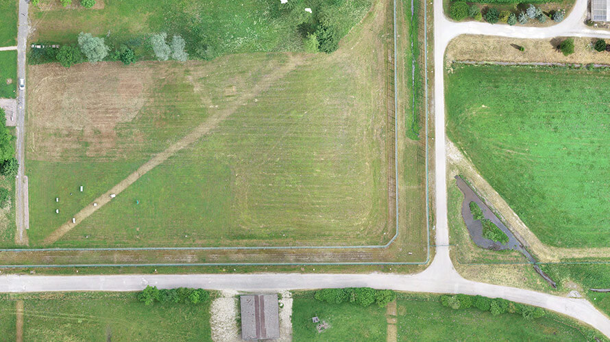 Um eine Wiese für freizeitliche Zwecke nutzen zu können, plant die Justizvollzugsanstalt Bernau die Entwässerung der Fläche. Um damit beginnen zu können, muss die Wiese zunächst vermessen werden – und das lässt sich insbesondere bei baumfreien Flächen sehr gut von oben machen.